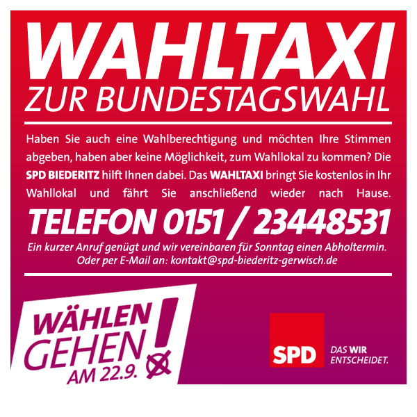 Am Sonntag, den 22. September 2013 wird ein neuer Bundestag gewählt. Haben Sie auch eine Wahlberechtigung und möchten Ihre Stimmen abgeben, haben aber keine Möglichkeit, zum Wahllokal zu kommen? Die SPD Biederitz hilft Ihnen dabei. Das WAHLTAXI bringt Sie kostenlos in Ihr Wahllokal und fährt Sie anschließend wieder nach Hause.